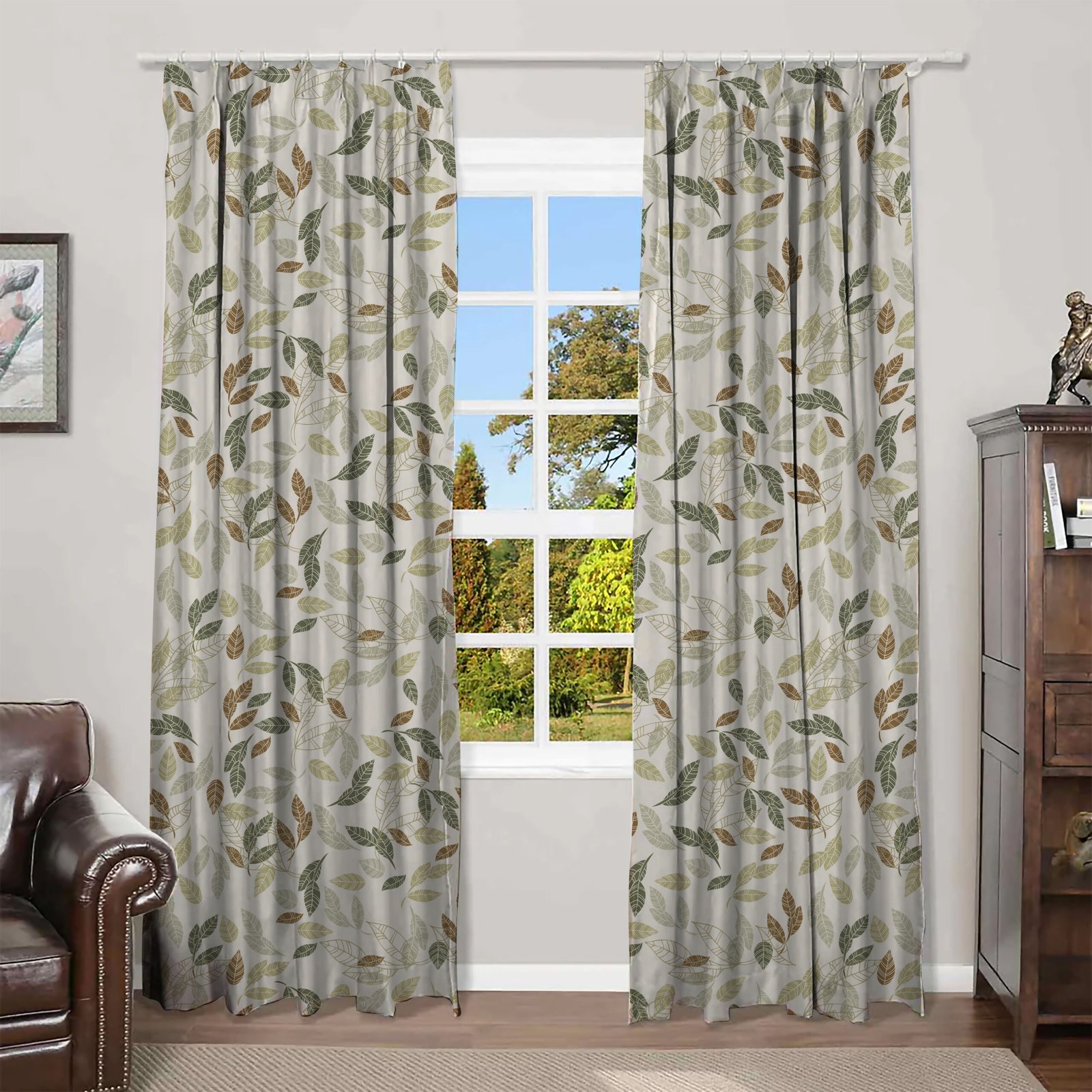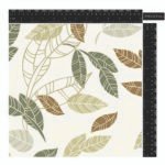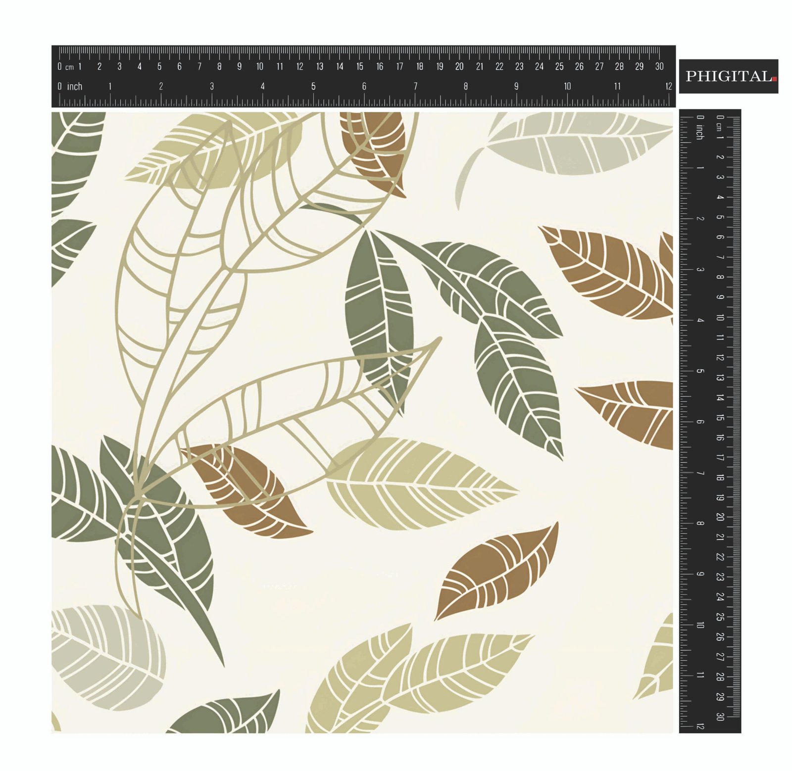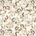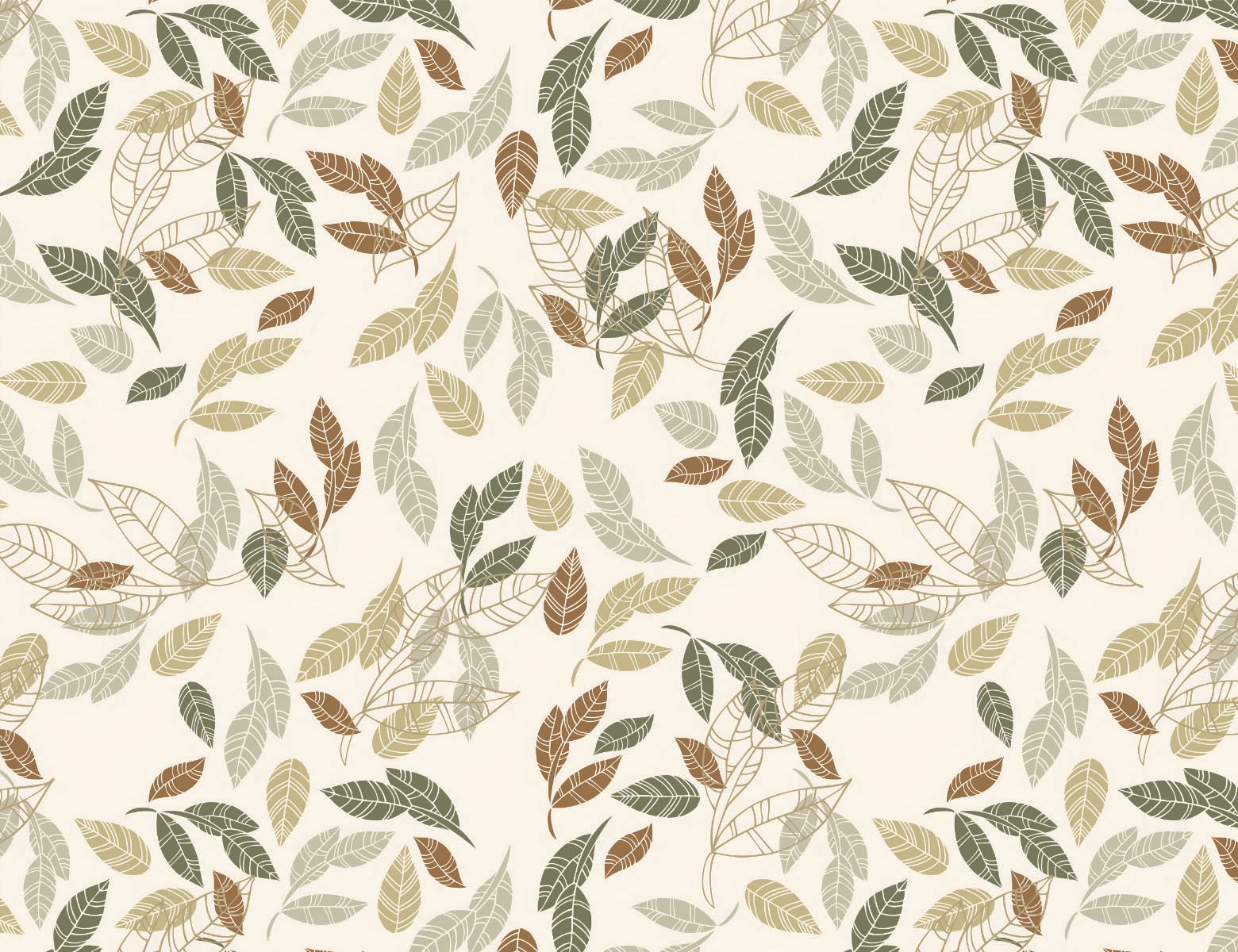 A delicate, repeating pattern of stylized leaves in muted shades of green, brown, and beige, scattered across a soft cream background.
