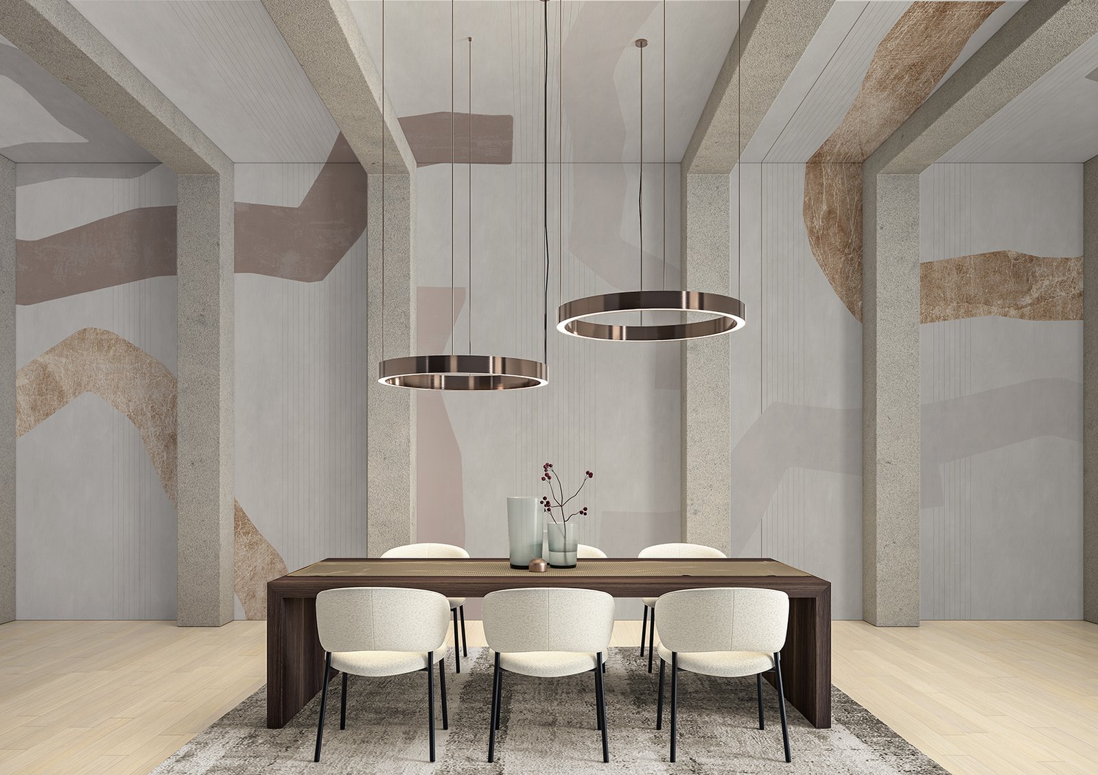 WP=165-B Primordial shapes and bold colors give life to a design that strikes a balance between strict geometry and the freehand irregular strokes of the drawing.