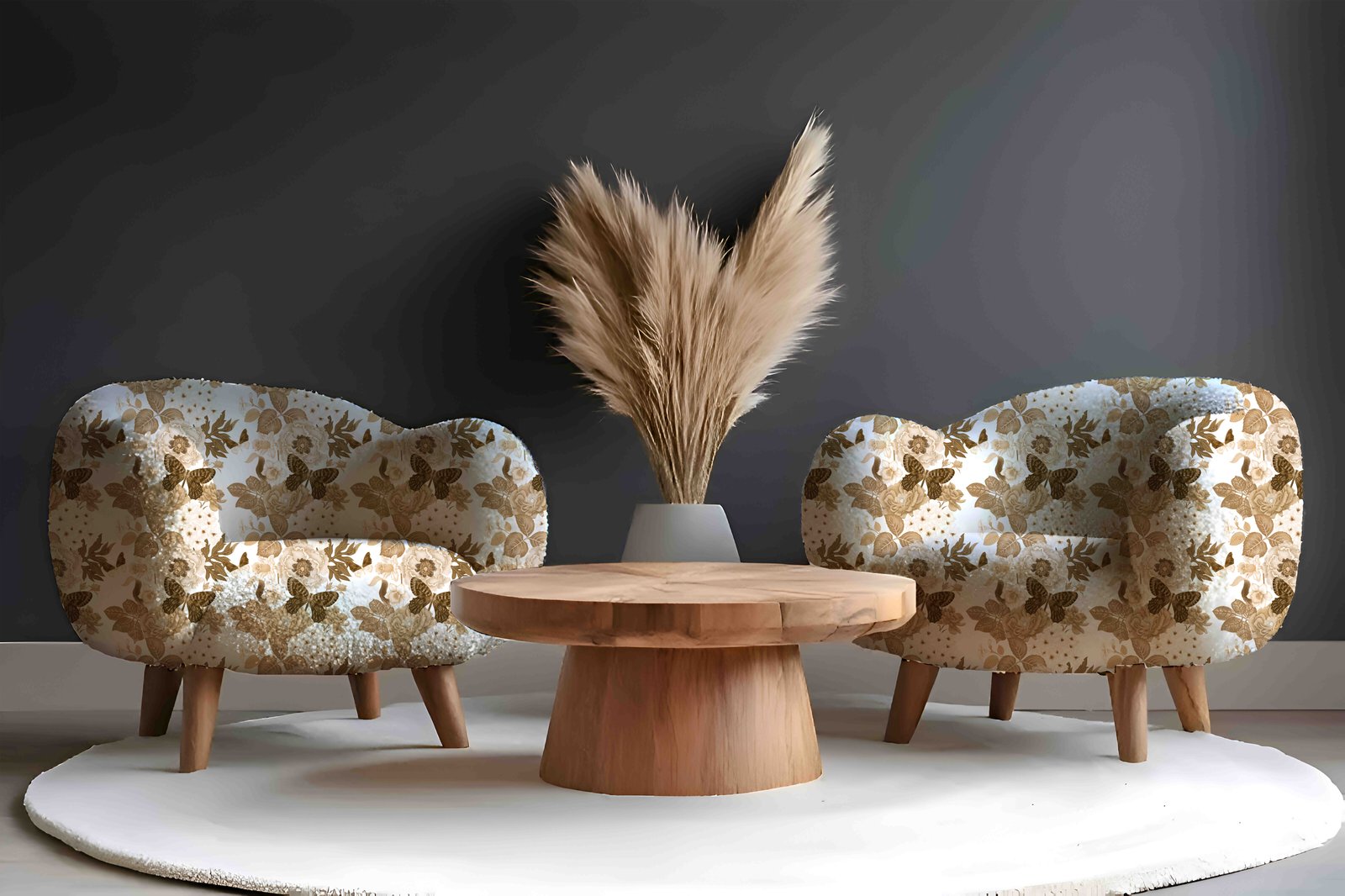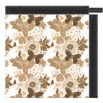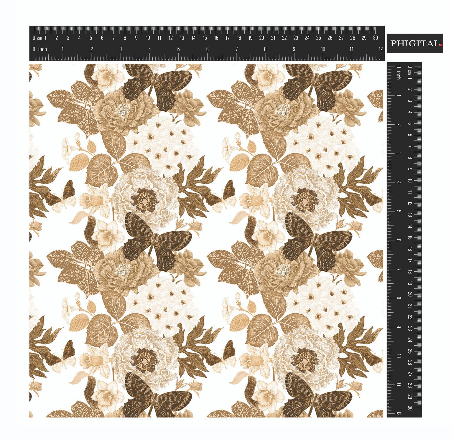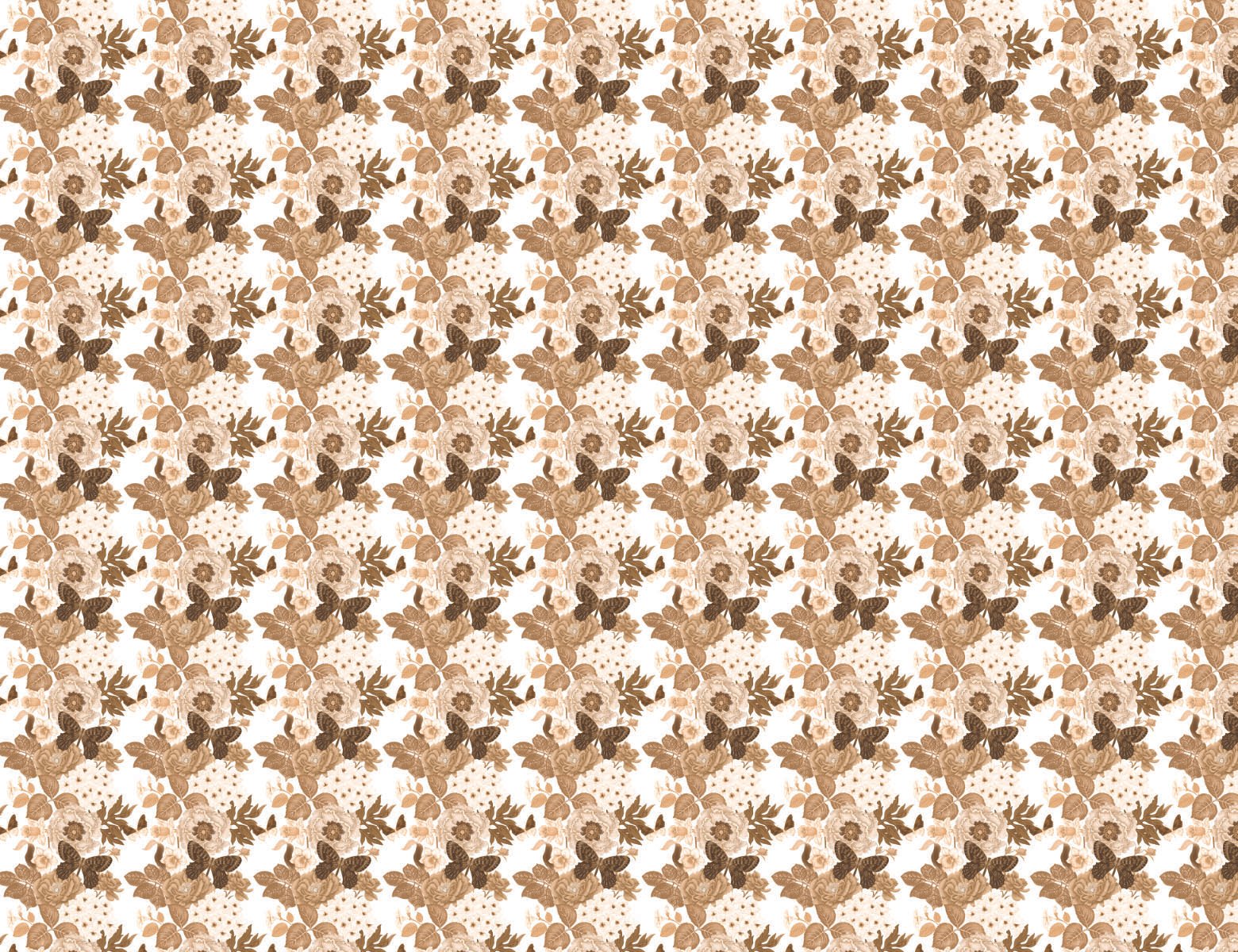 A detailed, repeating pattern of stippled flowers, leaves, and butterflies in warm sepia tones against a clean white background, evoking a vintage botanical illustration.