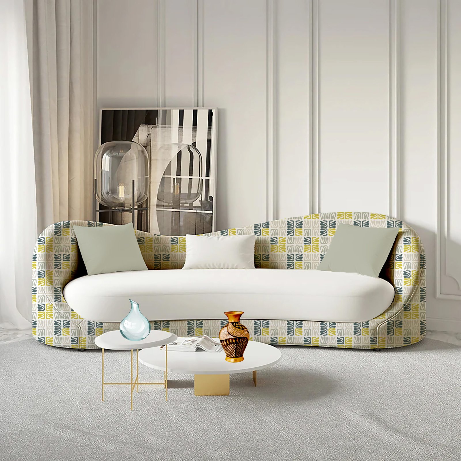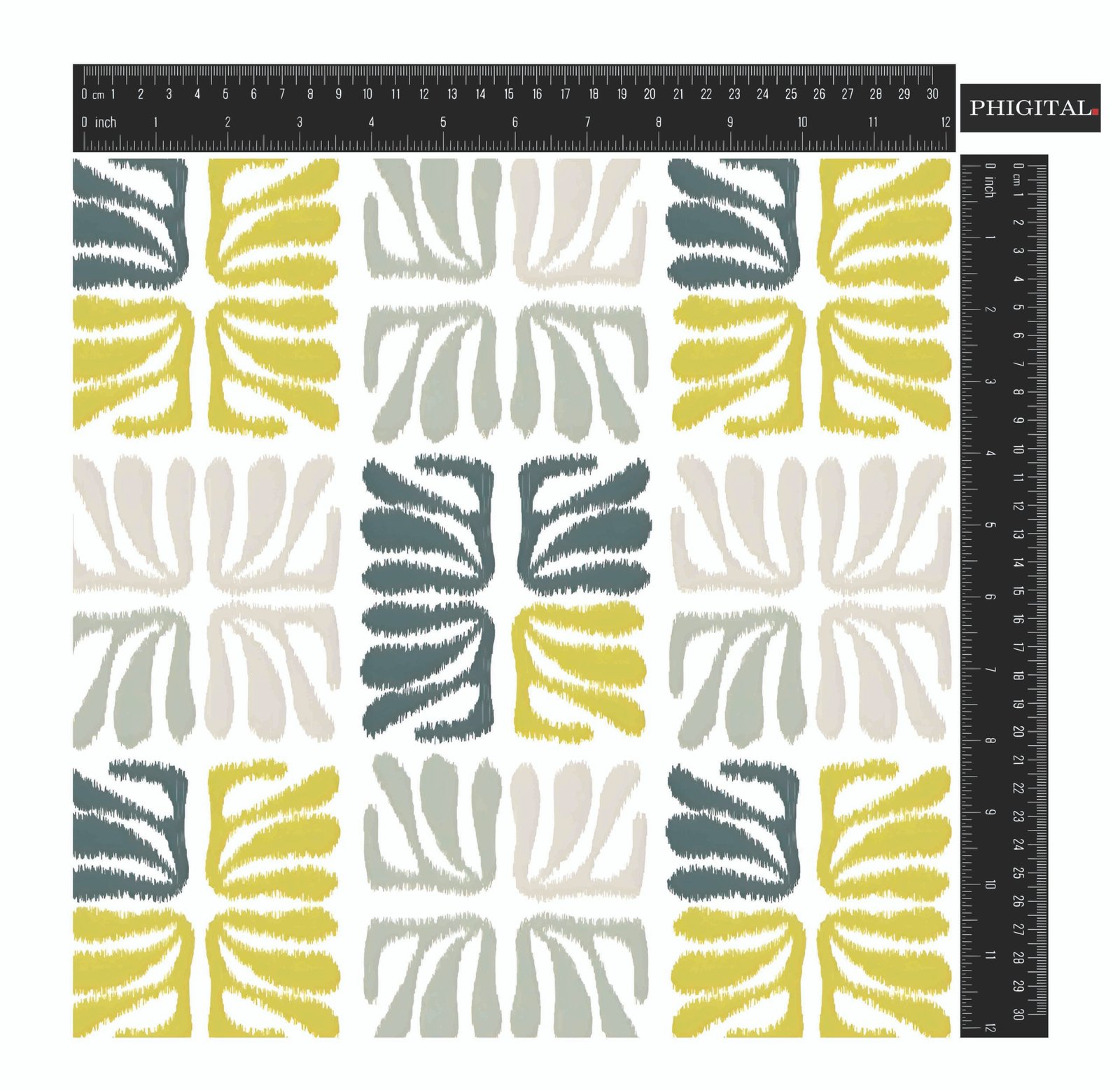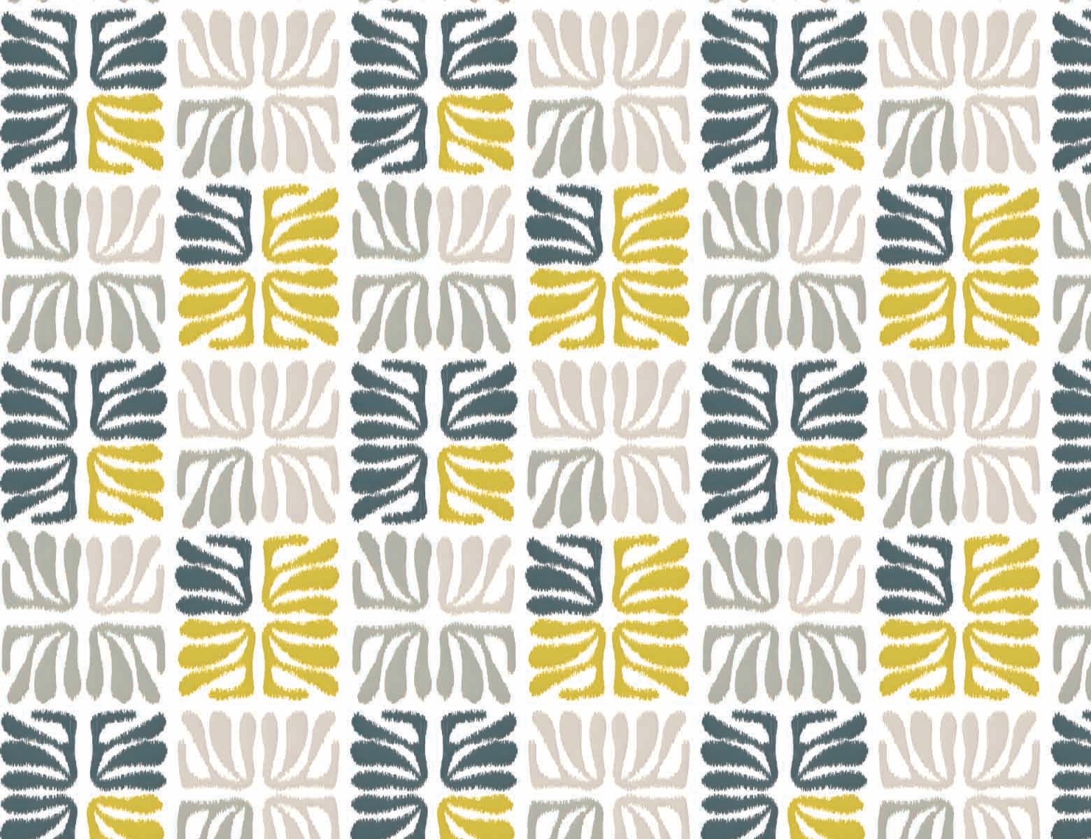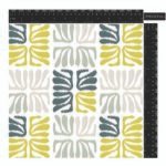 Repeated pattern of stylized, abstract shapes arranged in a square, resembling a four-leaf clover or pinwheel. The design utilizes a color palette of dark teal, vibrant lime green, light sage green, and a light cream, creating a balanced and organic yet modern aesthetic. The shapes have a slightly textured, handcrafted appearance.