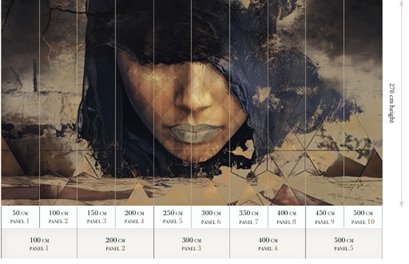 Desert Queen Rference No. - MU16001 Size: 500 cm x 270 cm All murals are printed by default with 50 cm panel widths, but can also be ordered using 100 cm wide panels if desired. "This mural can be custom made to fi t the dimensions of your wall : Non-woven matt (50 cm panel) Textured Vinyl (50 and 100 cm panels) Textile (50 and 100 cm panels) Metallic Gold (50 cm panel) Silk Gold (50 and 100 cm panels Grasscloth* (85 cm panel)* can only be ordered as personalized walls "