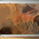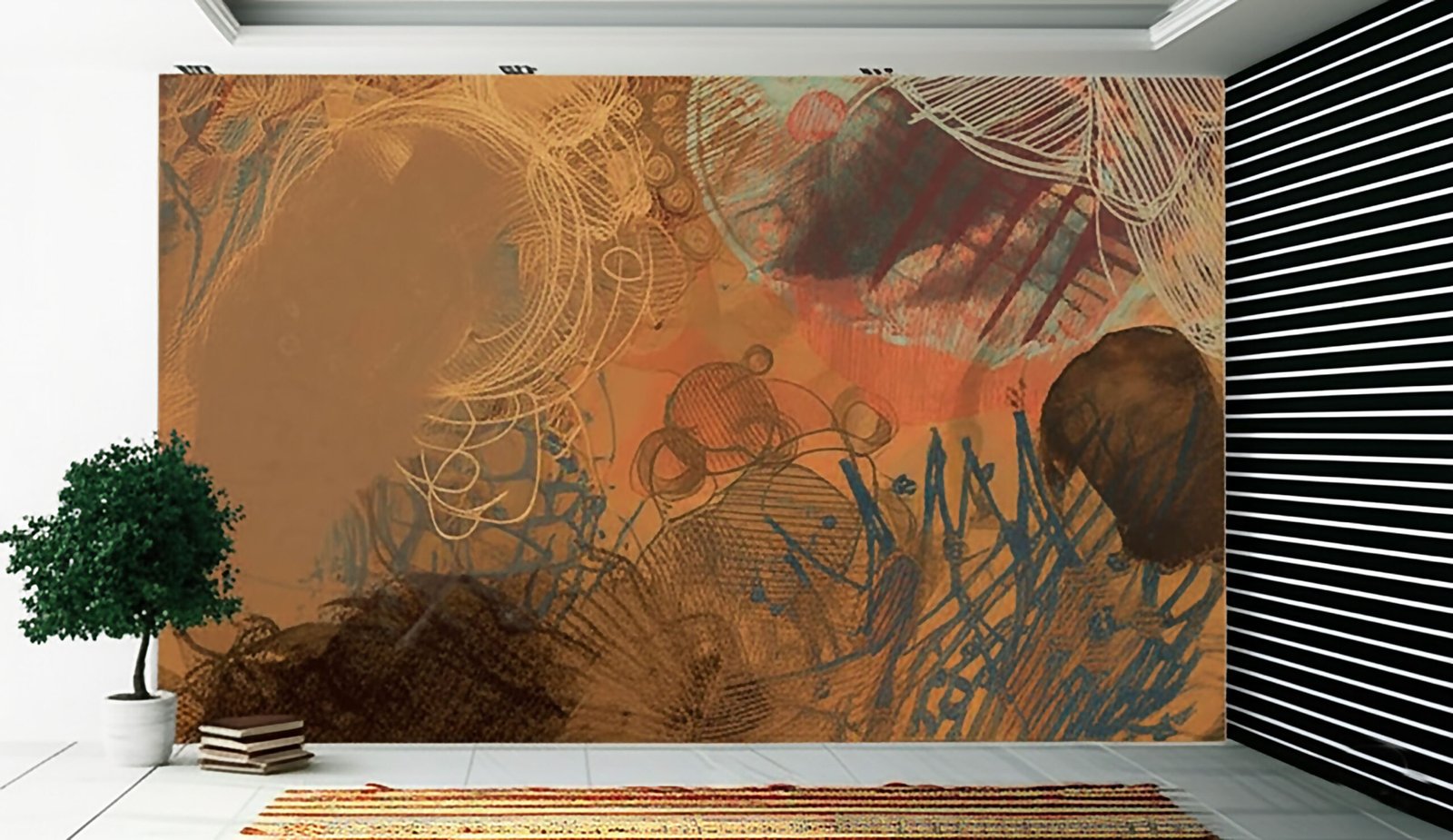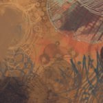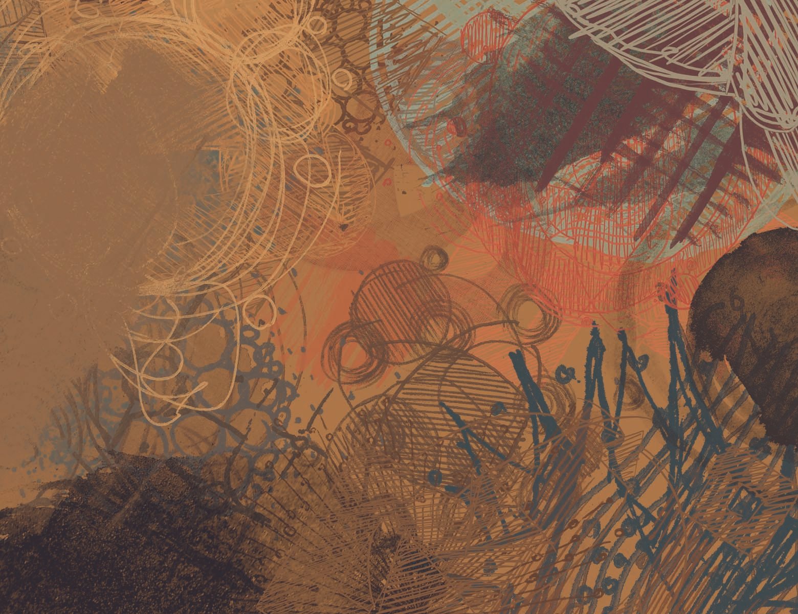 An abstract, non-repeating composition featuring layers of freehand scribbles, lines, and circular motifs in a warm, earthy palette of brown, beige, and muted teal, creating a textured and somewhat organic feel.