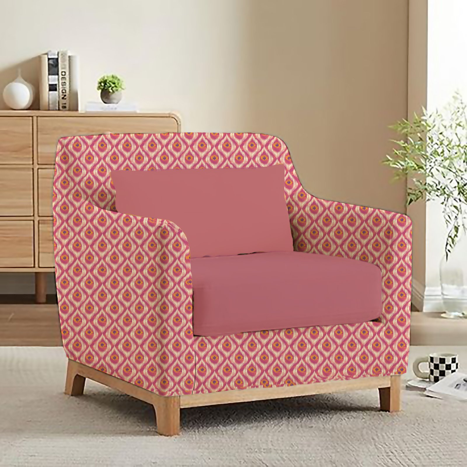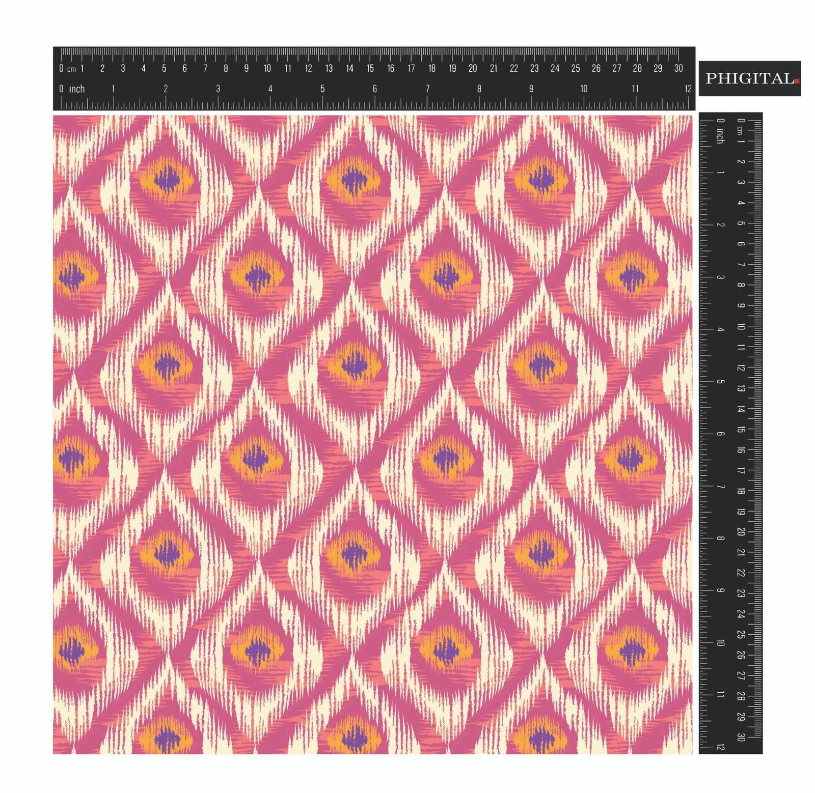 A vibrant Ikat pattern with a striking geometric design. The repeating diamond shapes, filled with a mix of warm and cool tones, create a visually captivating and textured effect.