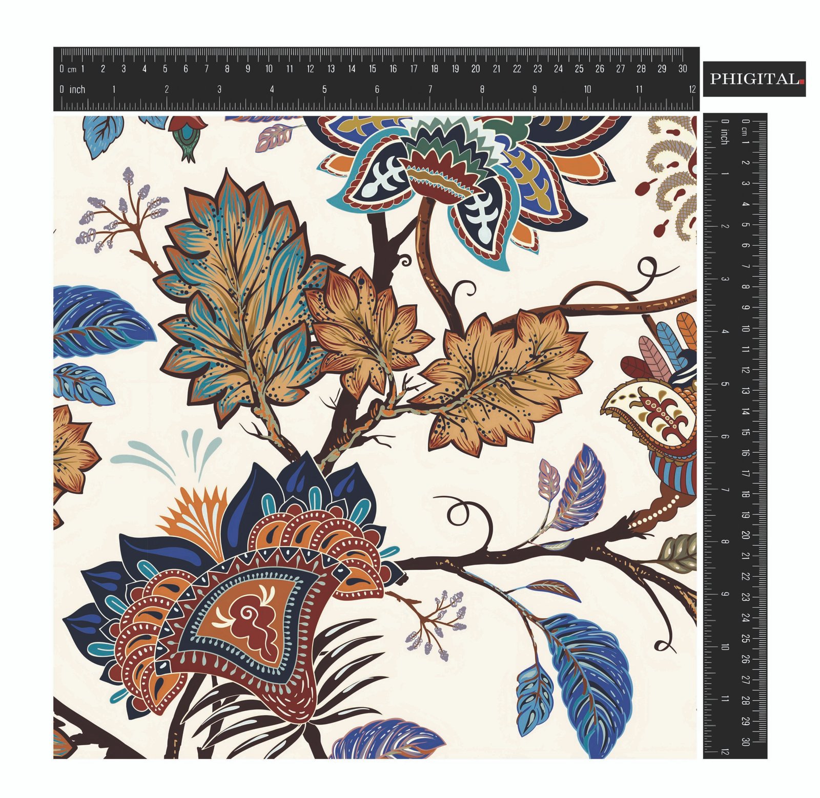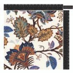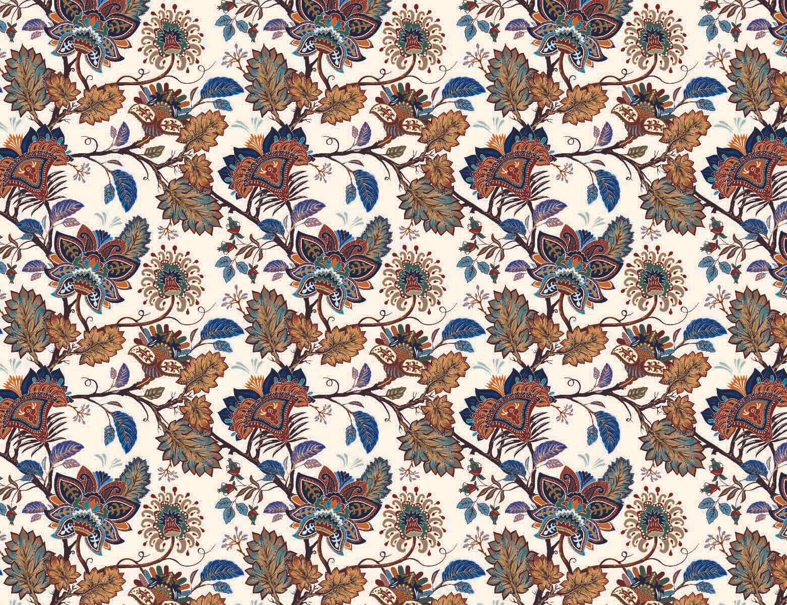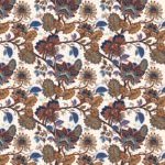 An intricate floral pattern with a rich, bohemian feel. The stylized flowers and paisley-inspired elements intertwine in a vibrant palette of blues, browns, and oranges against a light background.