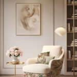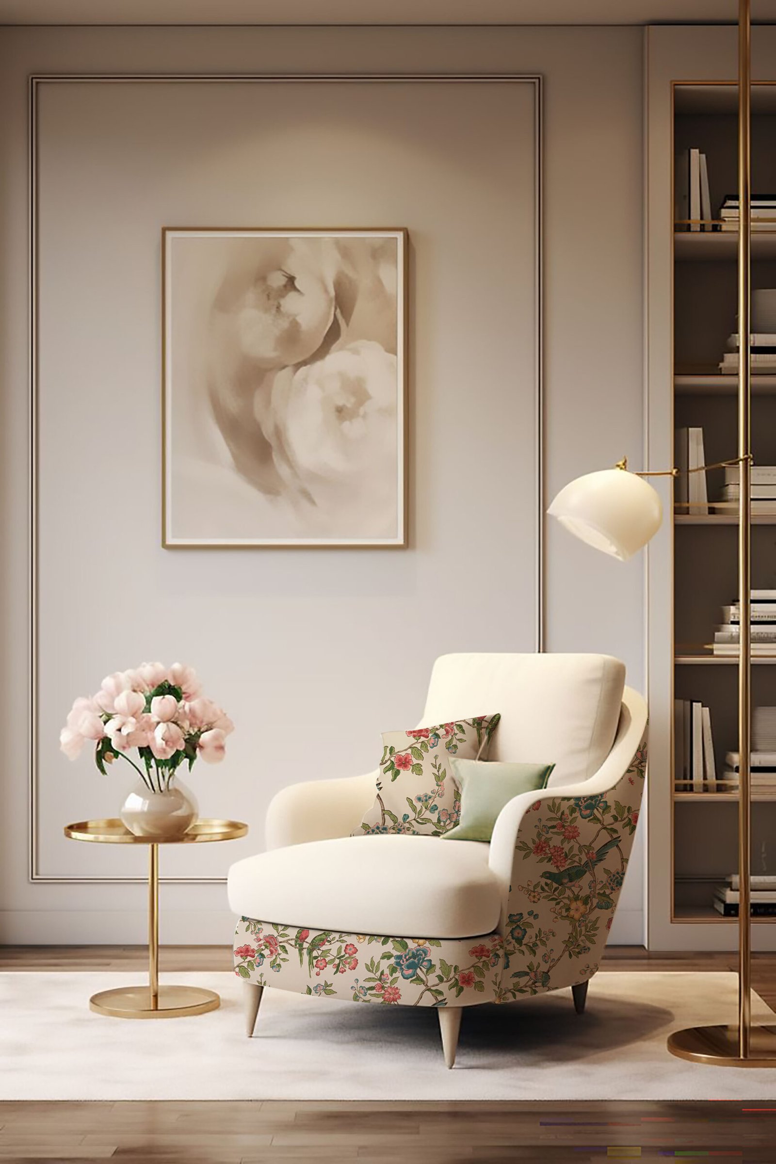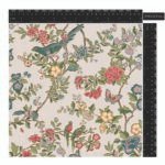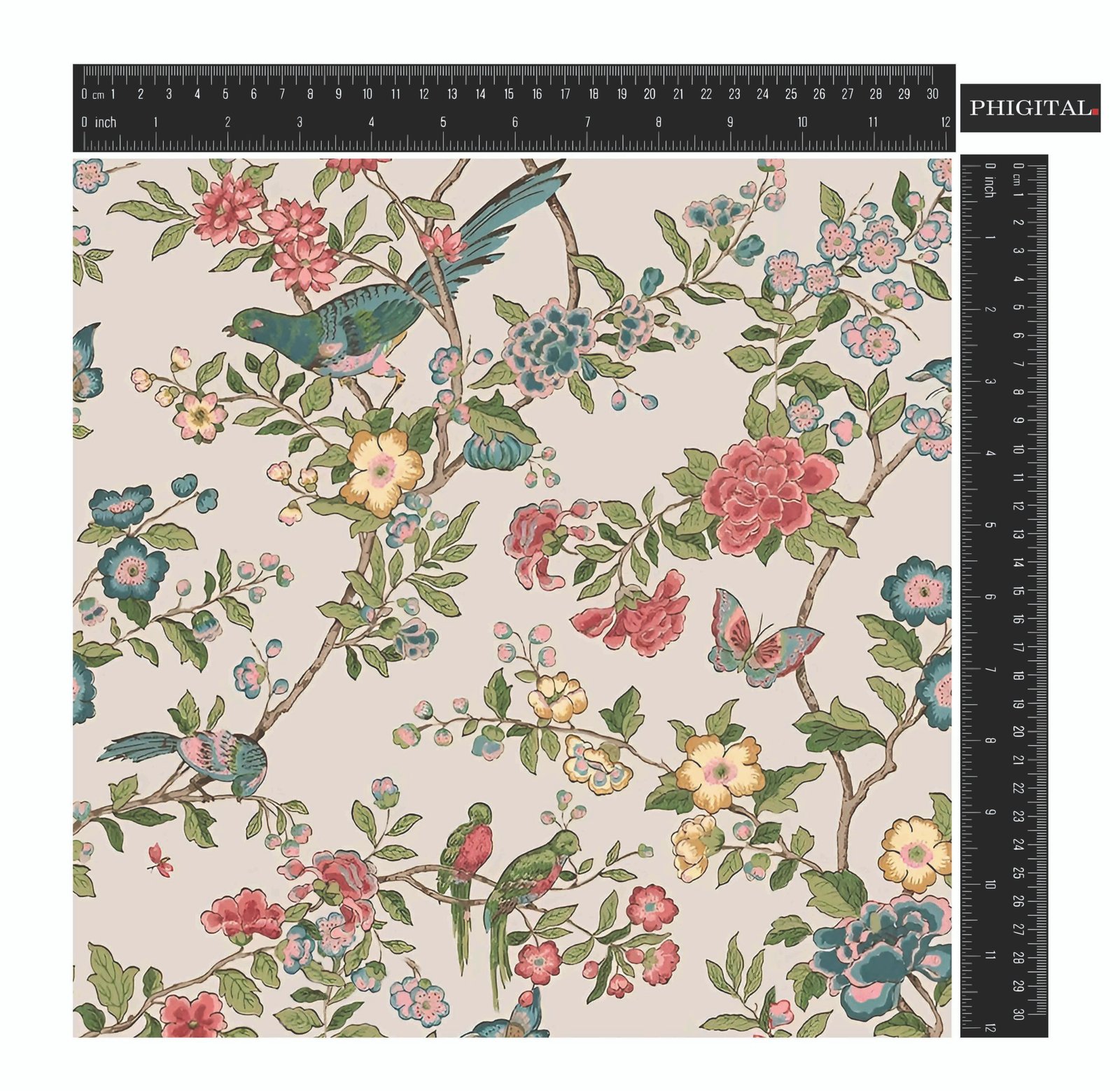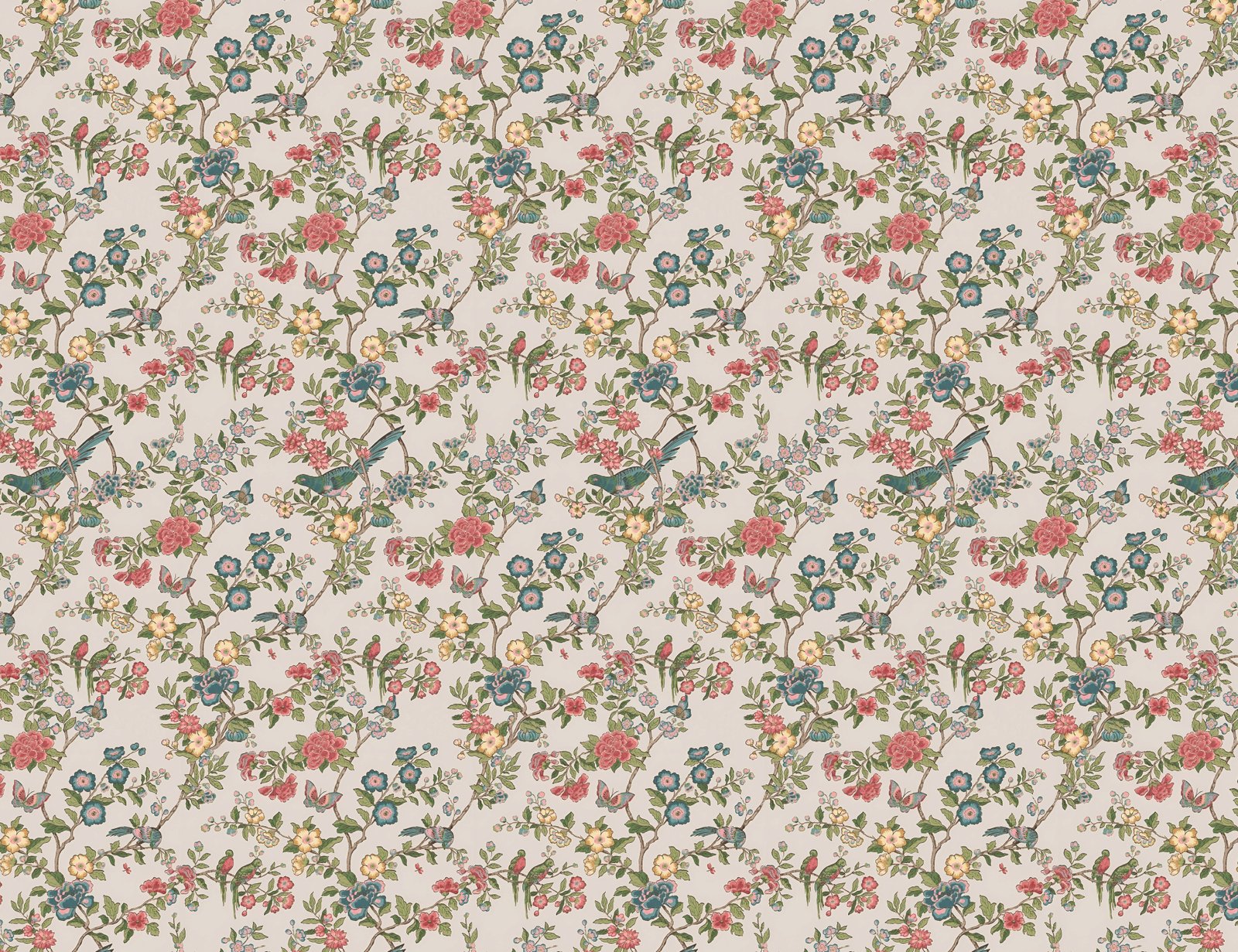 A delicate, repeating pattern of birds perched among flowering vines with small red, blue, and yellow blossoms, set against a soft, light grey background.