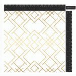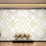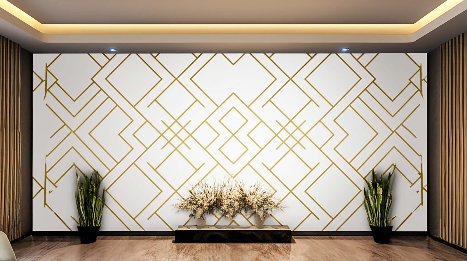 Shimmering gold lines forming a complex geometric lattice against a pure white backdrop. The delicate lines intersect to create a repeating network of diamonds, squares, and other polygonal shapes, exuding a clean, modern aesthetic with a hint of Art Deco elegance. The design evokes a sense of luxurious simplicity and rhythmic harmony.