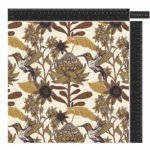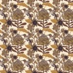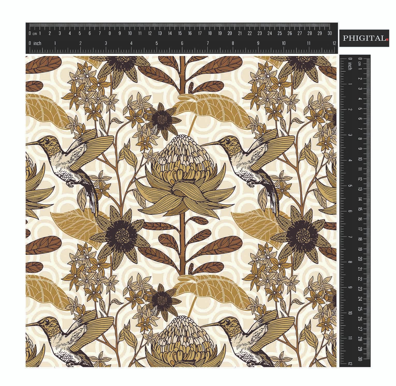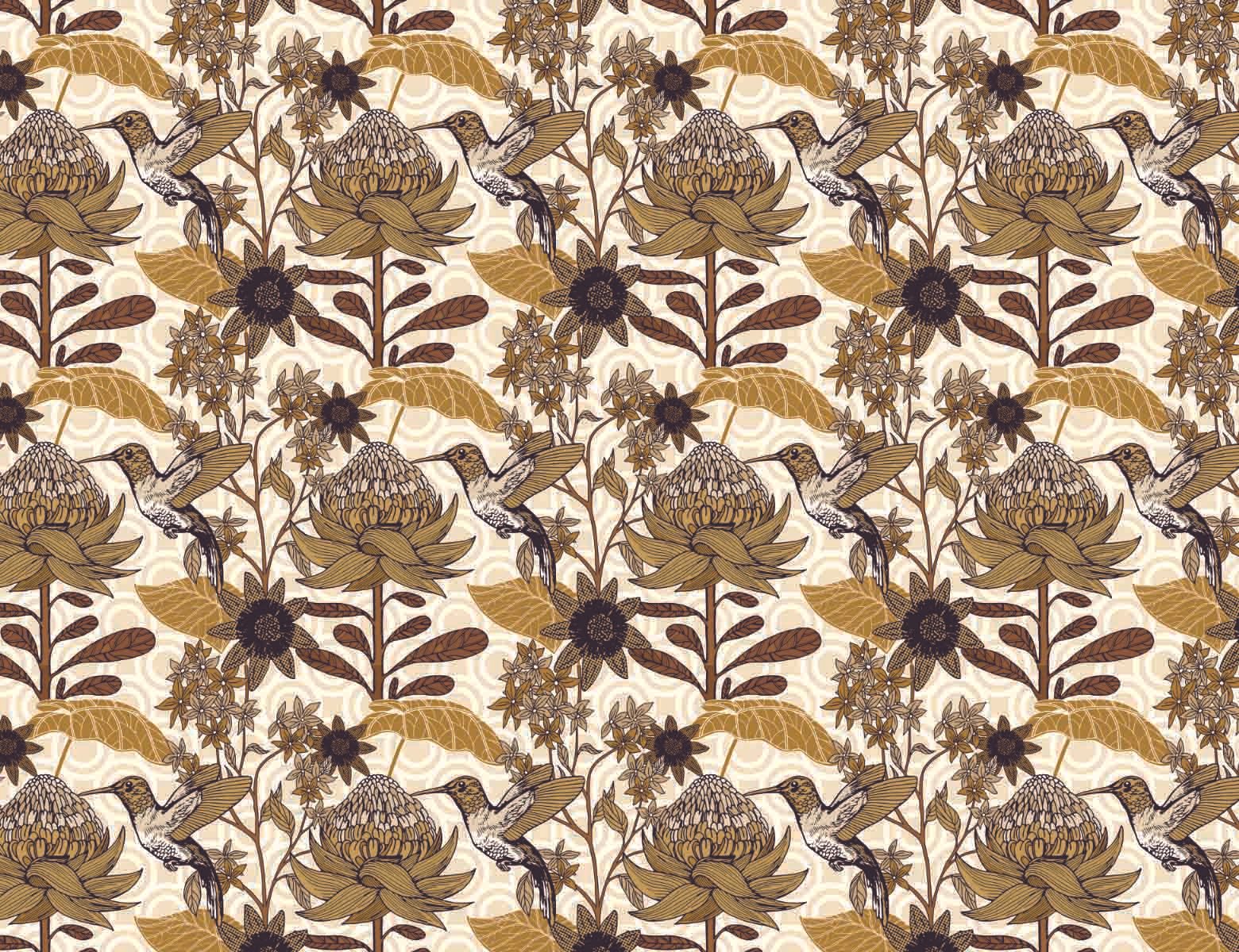 A repeating pattern featuring a hummingbird in flight among stylized protea flowers, smaller blossoms, and large leaves in shades of brown and gold against a patterned cream background.