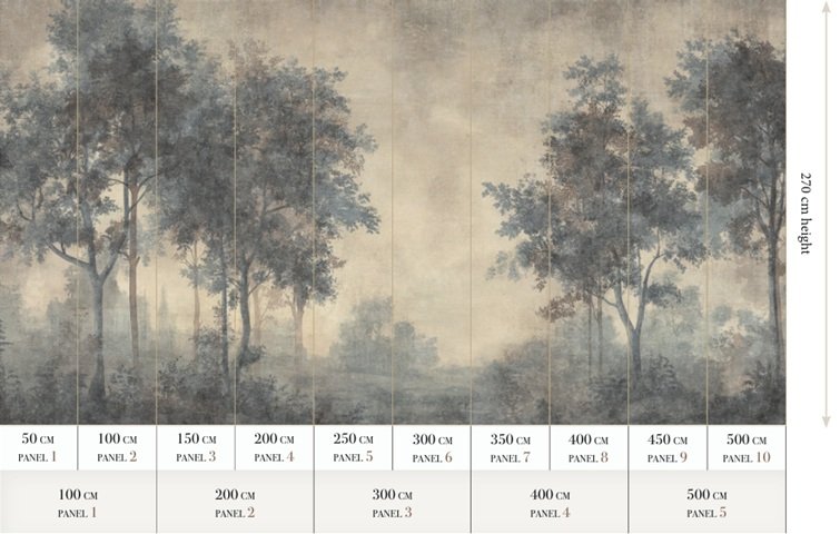 Size: 500 cm x 270 cm All murals are printed by default with 50 cm panel widths, but can also be ordered using 100 cm wide panels if desired.