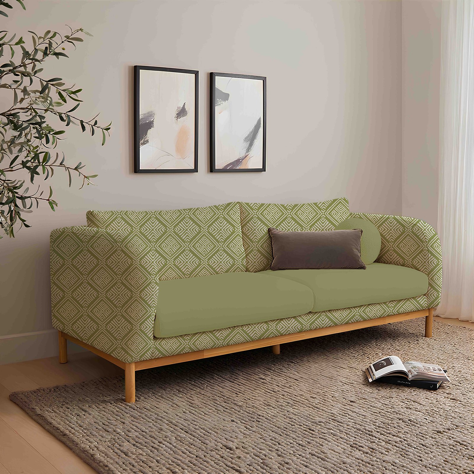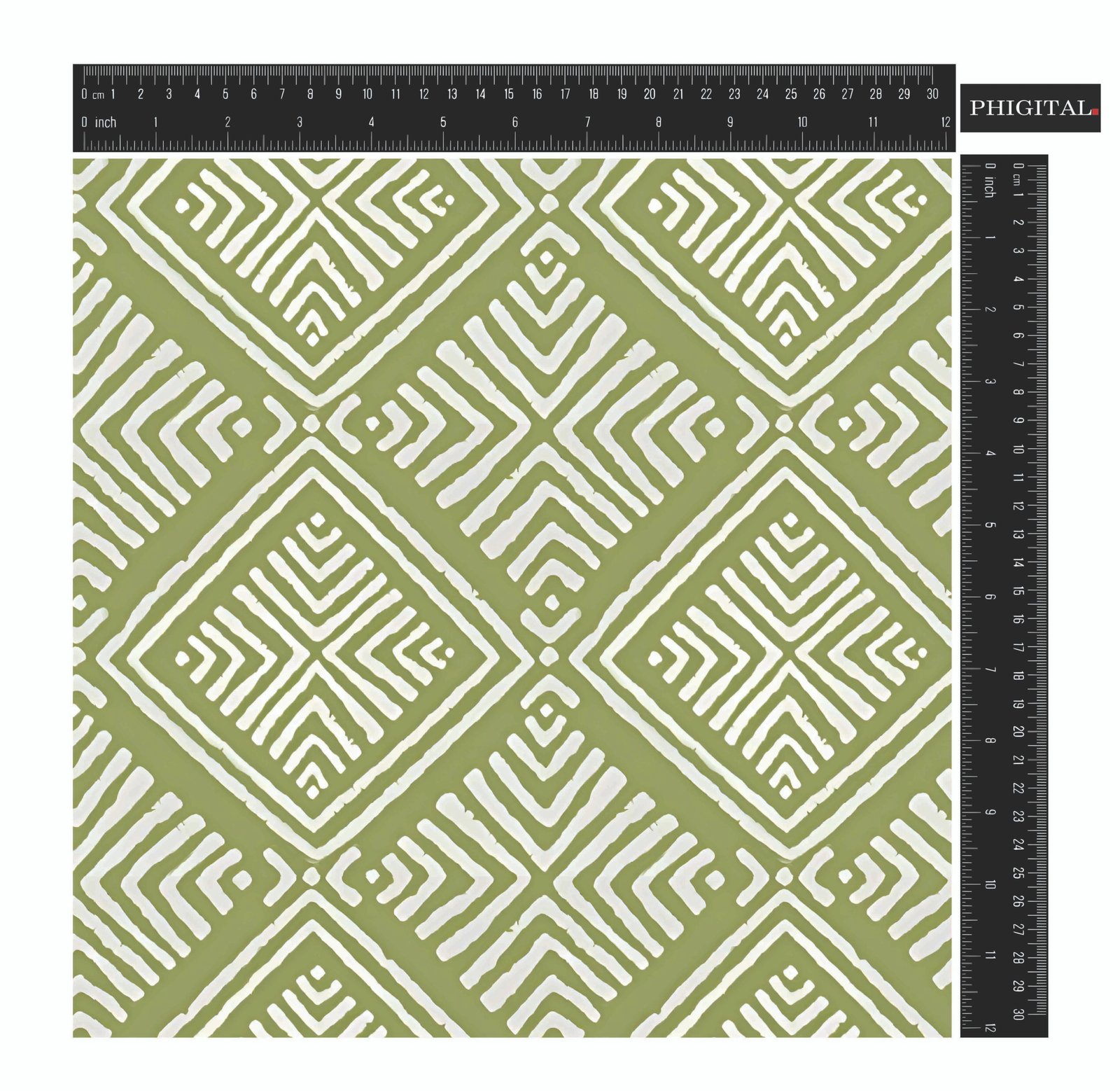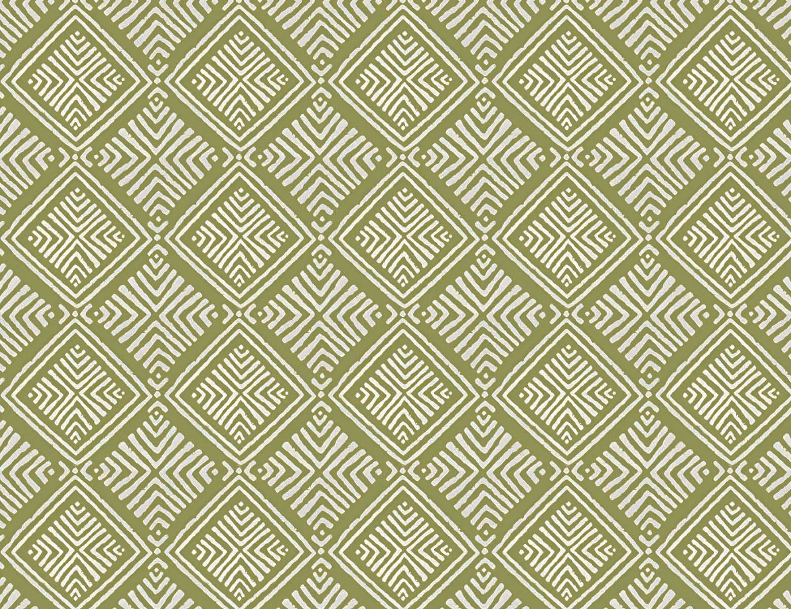 Vibrant, seamless pattern characterized by repeating diamond (rhombus) shapes filled with intricate white lines and dashed patterns, all set against a lively lime green background. The white lines possess a distinct, hand-drawn or block-printed texture, giving the geometric design a charming folk-art or tribal aesthetic. The dense, interlocking arrangement creates a dynamic and energetic visual texture across the entire surface.