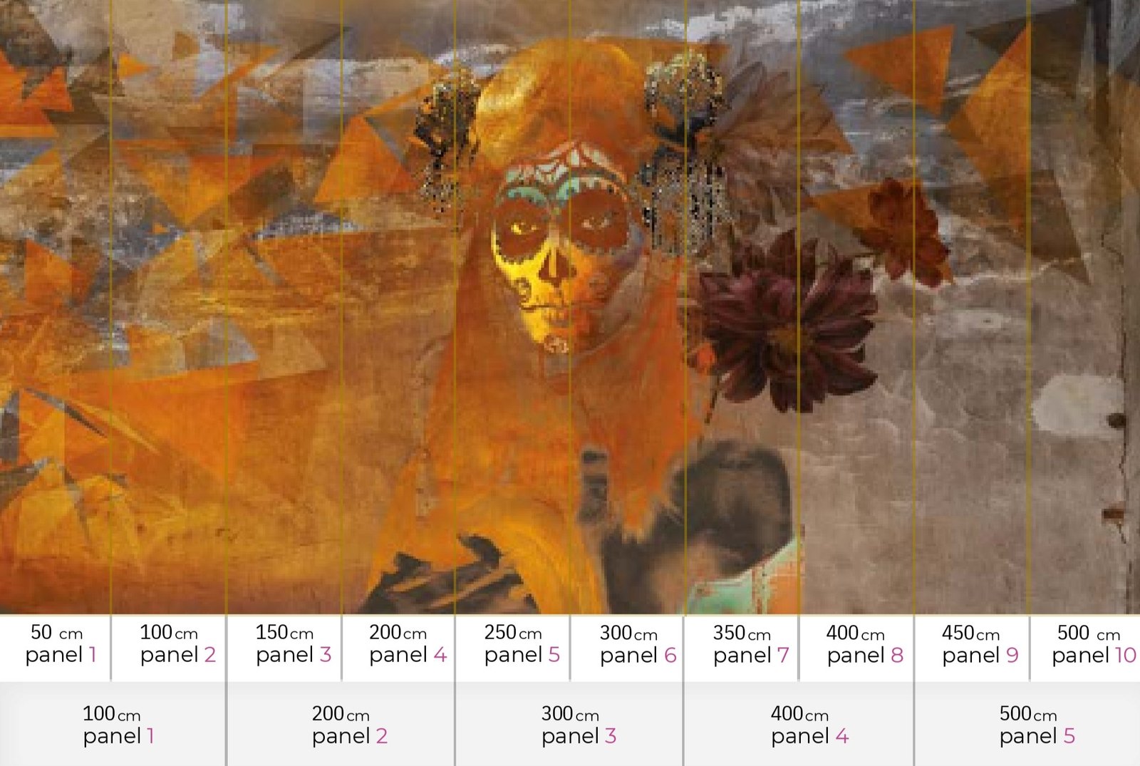 Size: 500 cm x 270 cm All murals are printed by default with 50 cm panel widths, but can also be ordered using 100 cm wide panels if desired.