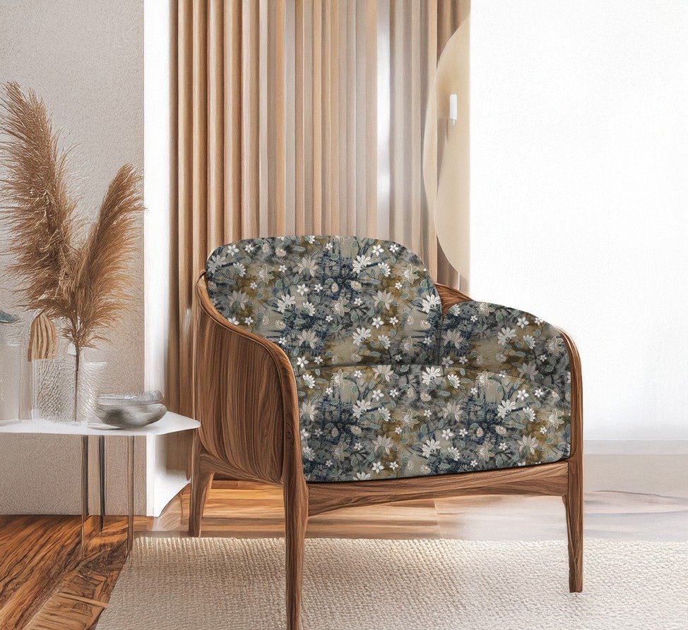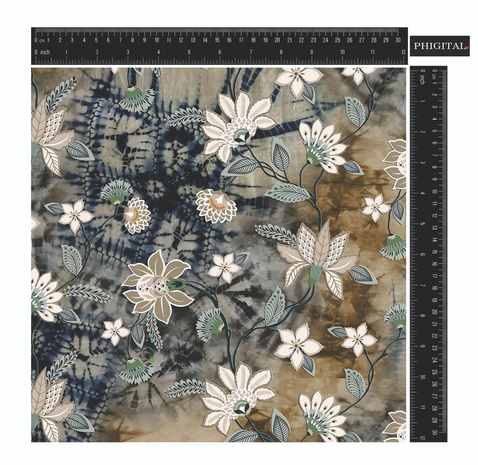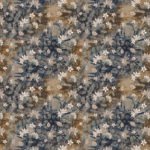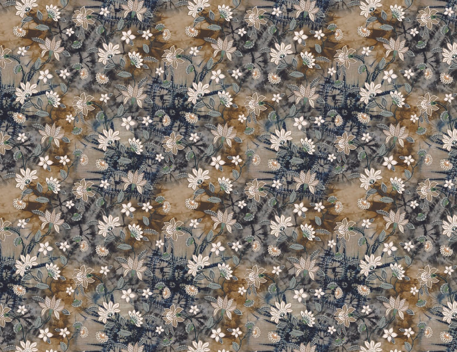 A floral pattern featuring delicate white and beige blossoms with muted green leaves, intertwined with dark indigo and tan tie-dye effects in the background. The combination of natural and textile elements creates a unique and artistic design.