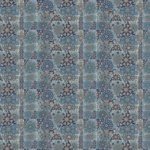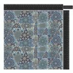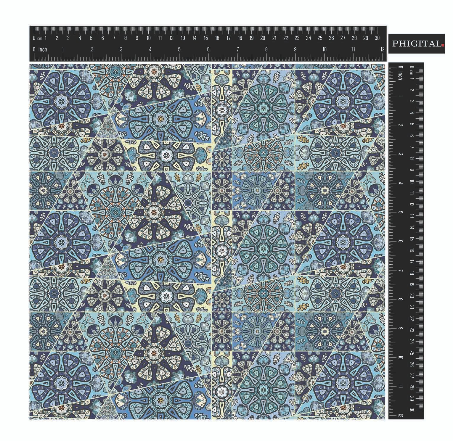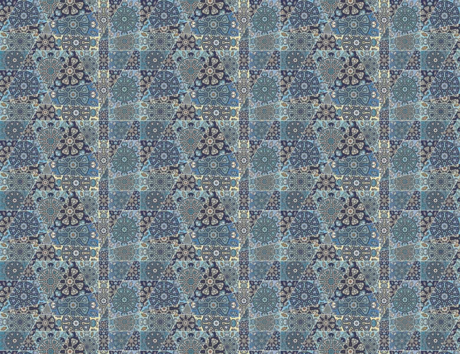 A repeating patchwork pattern composed of intricately detailed triangular and polygonal tiles in a cool palette of blues, teals, and muted yellows, featuring floral and geometric medallion designs.