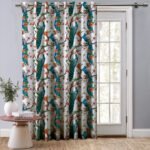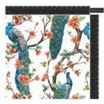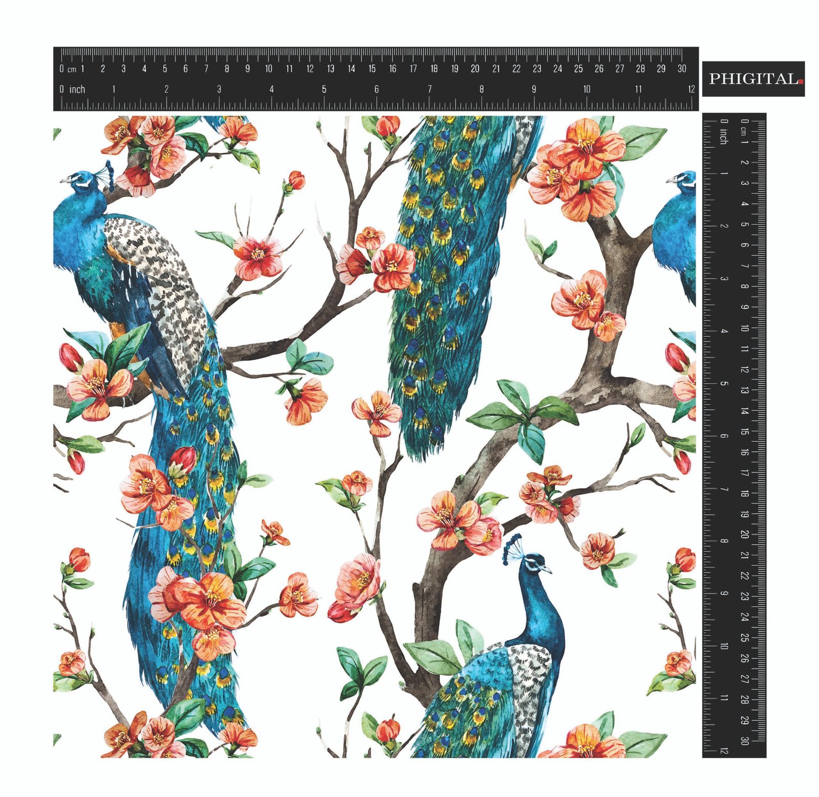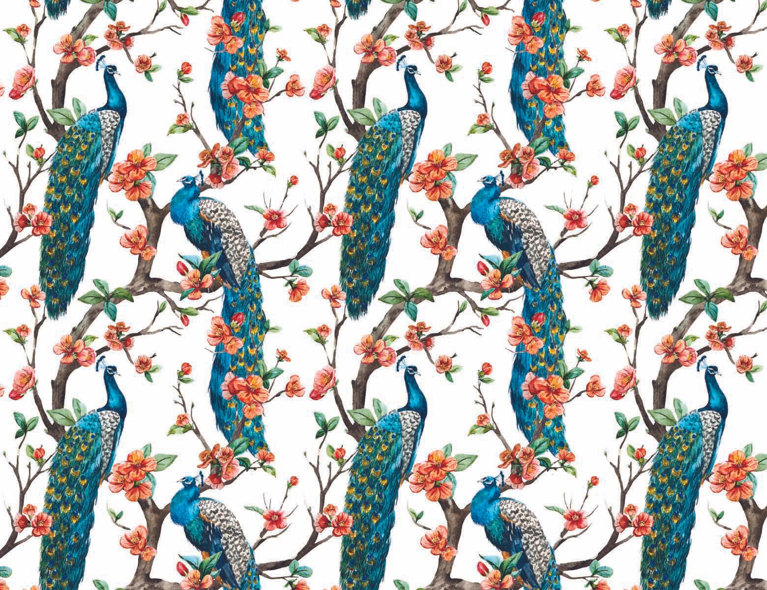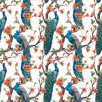 A vibrant, repeating watercolor pattern featuring elegant blue and green peacocks perched on blossoming branches with orange-red flowers against a white background.