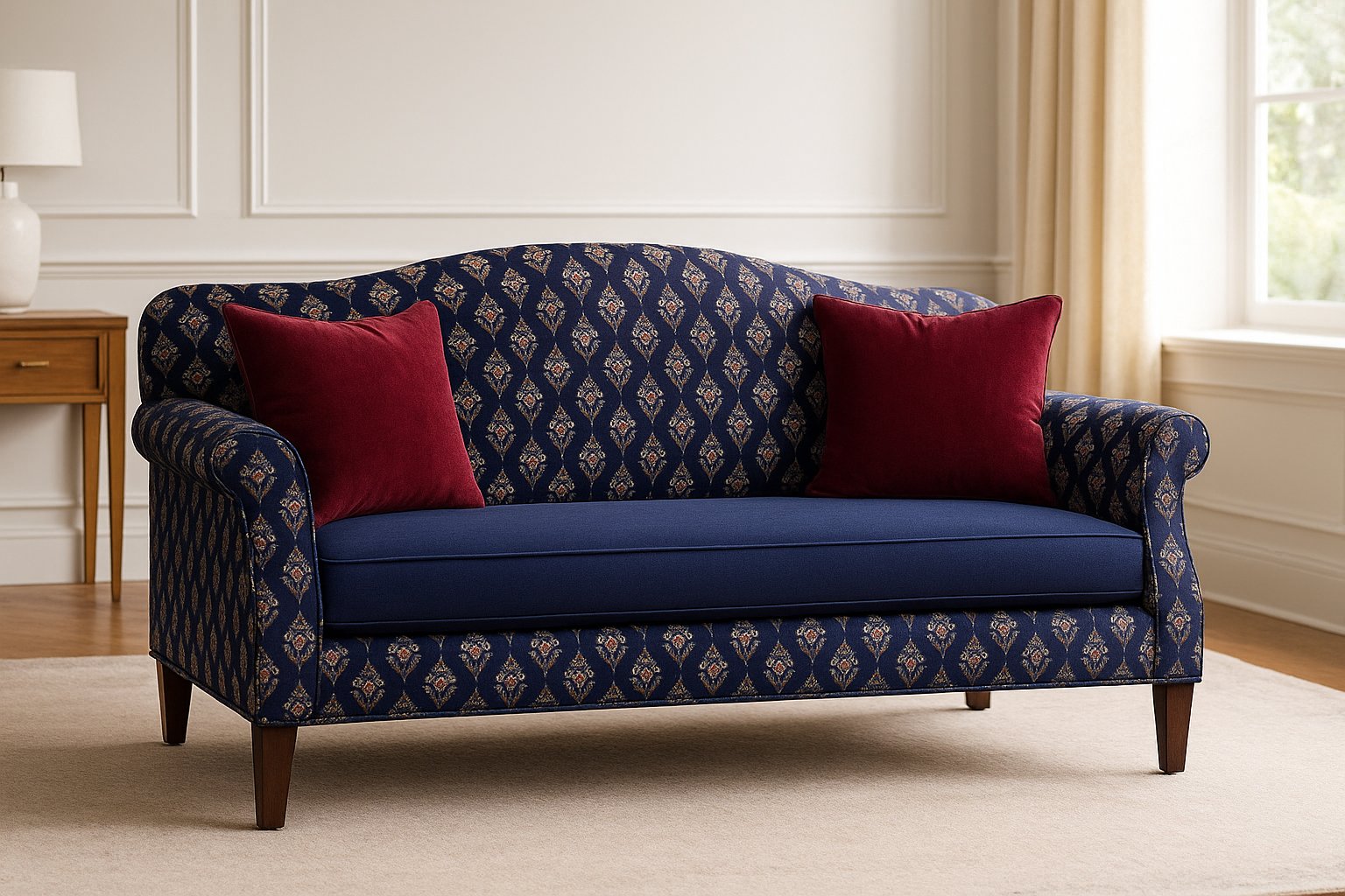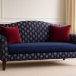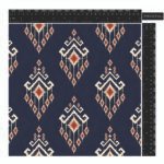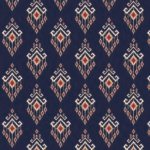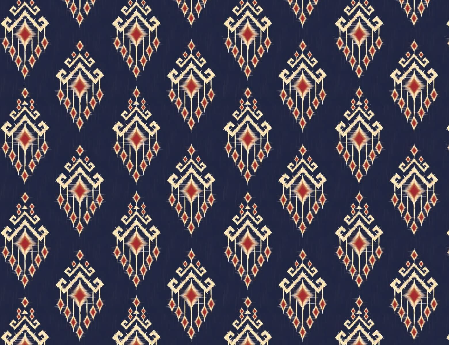 A dramatic, seamless pattern featuring highly ornate, vertically oriented motifs reminiscent of traditional ikat or tribal textile designs. Set against a deep navy blue background, each striking element is rendered in a muted gold or cream, highlighted by a vibrant crimson or ruby red center, and characterized by sharp, feathered edges. The dense, repeating arrangement creates a rich, sophisticated, and culturally inspired visual tapestry.