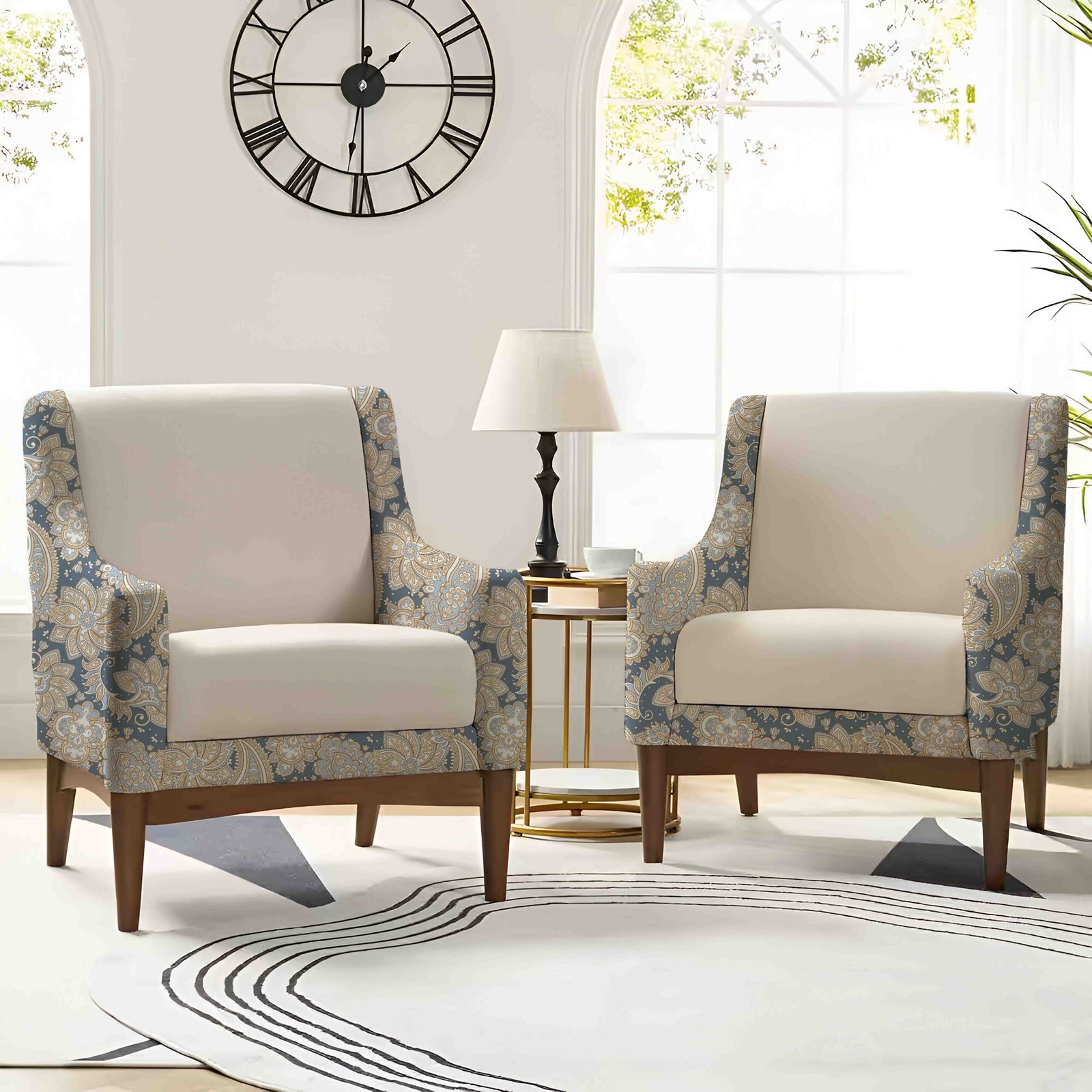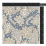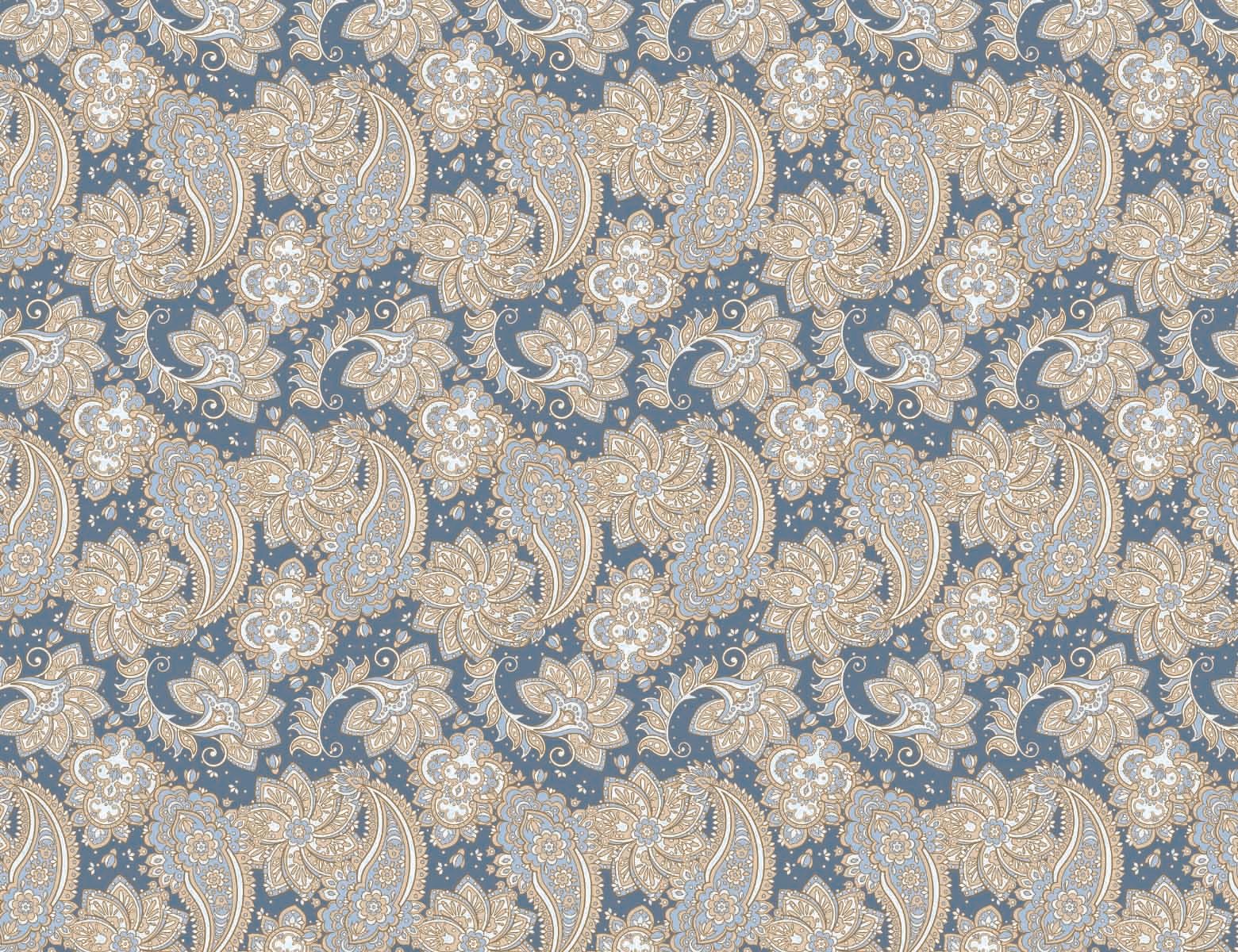 A flowing, repeating pattern of traditional paisley and floral motifs in soft shades of blue and beige against a muted blue-grey background, creating a calming and intricate design.