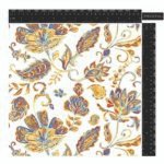 A vibrant, repeating pattern of watercolor-style paisley and floral motifs in rich hues of blue, gold, and rust against a white background, creating a fluid and artistic design.