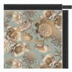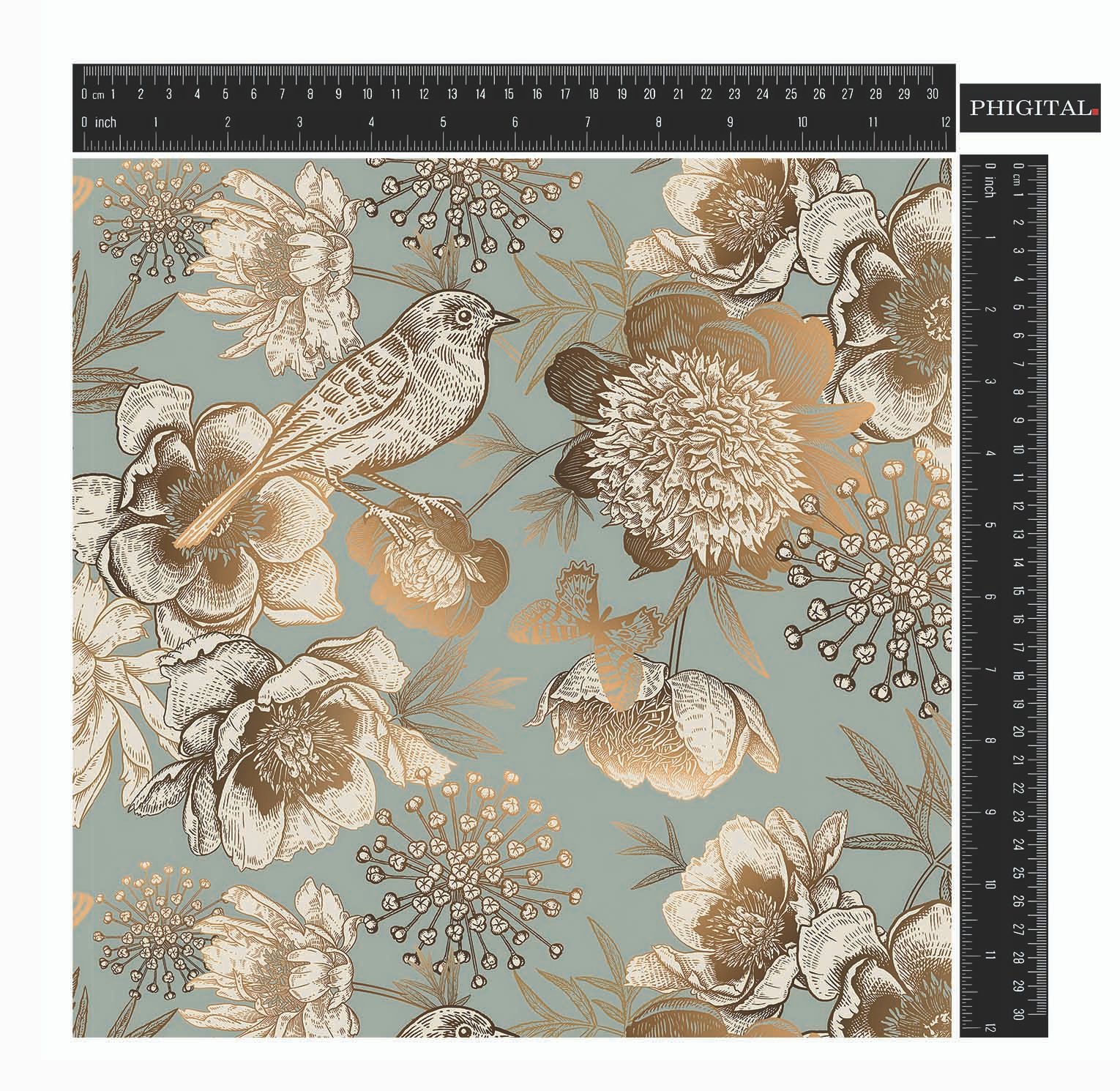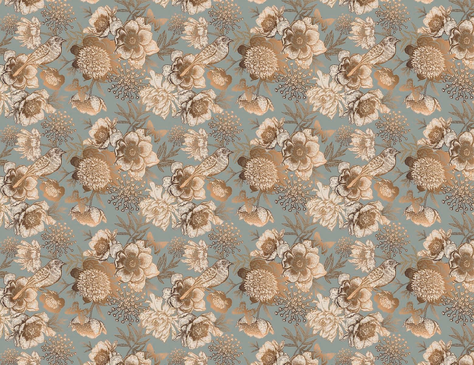 - A delicate illustration of birds perched among blooming flowers and ethereal butterflies on a soft, muted blue background. The fine lines and subtle metallic highlights create a serene and enchanting scene.