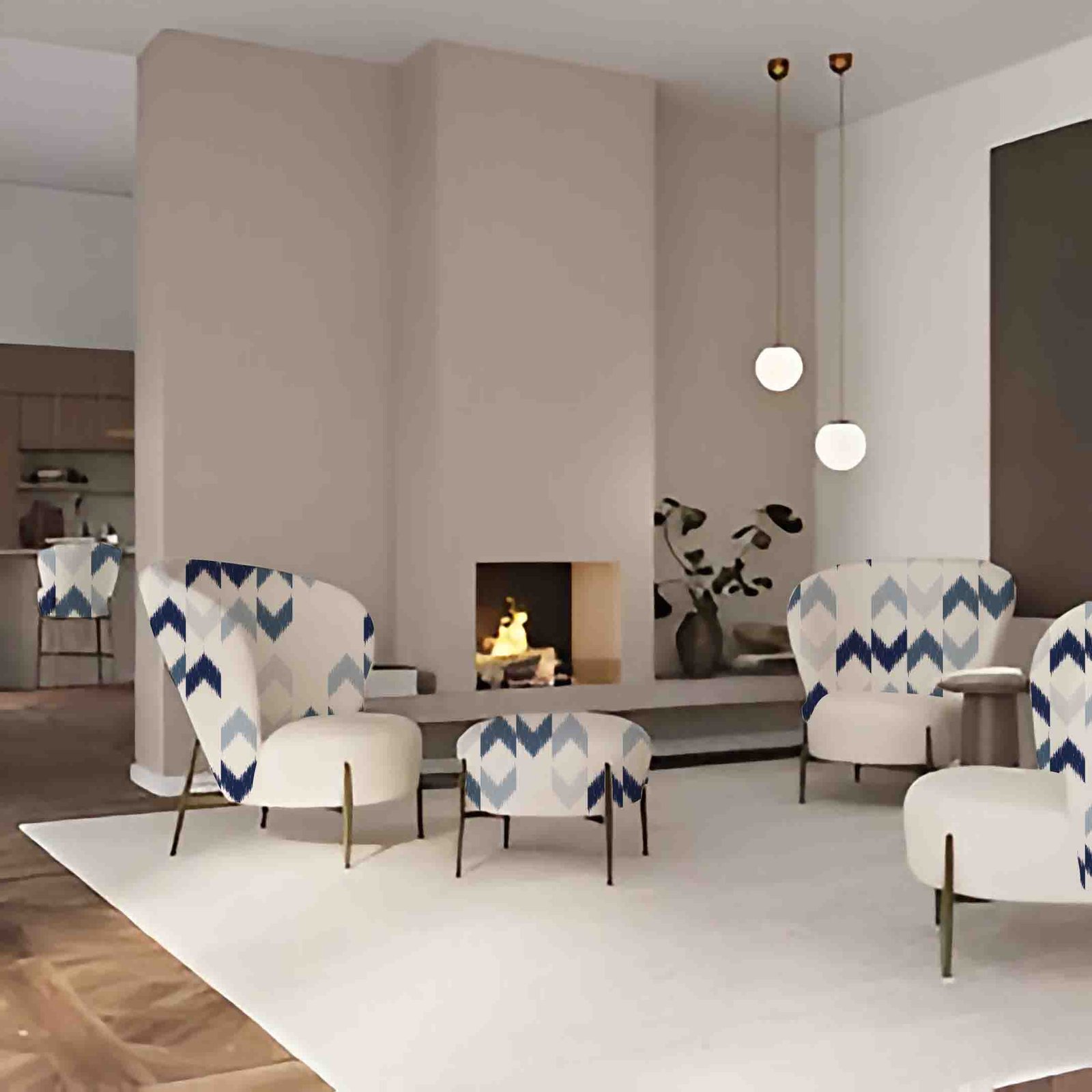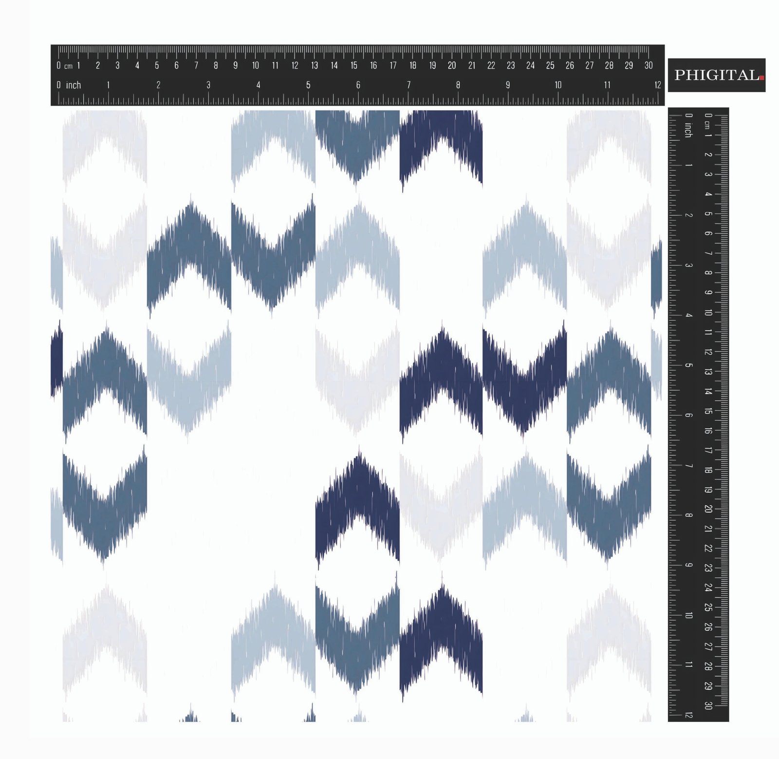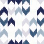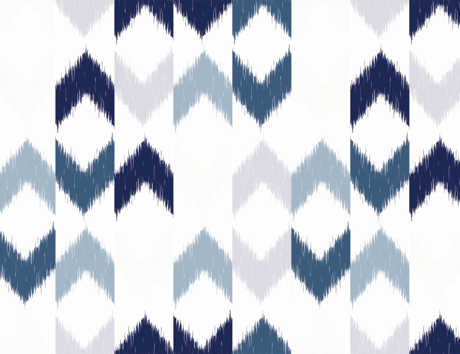 A repeating pattern of textured chevron shapes in varying shades of blue and grey against a white background, resembling a woven ikat textile with a subtle, handcrafted feel.